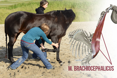 Durch das gleichförmige Nachhintenziehen der vorderen Extremität kann ein guter Dehnungseffekt auf den M. Brachiocephalicus (Unterhalsmuskulatur) erreicht werden.