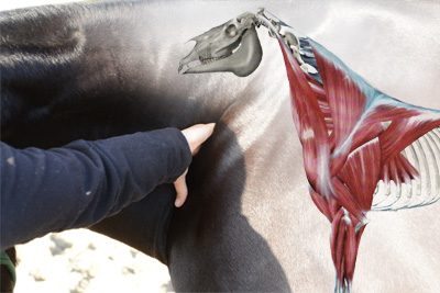 Mittels Faszientechniken können z.B. Verspannungen im Serratus- und Halsmuskelbereich gut gelöst werden. Durch vorsichtiges In-die-Tiefe-Gehen werden zusätzlich die darunter liegenden nervalen Strukturen stimuliert, wodurch es zu einer tief greifenden Entspannung des Pferdes kommen kann.